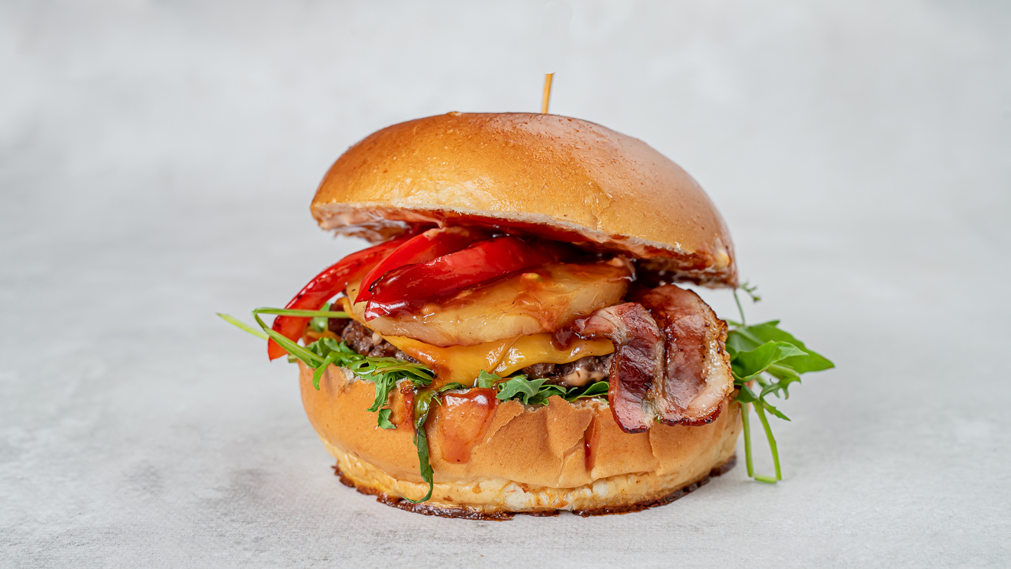 sos firmowy, dżem bekonowy, wołowina 100%, grillowany boczek, grillowane pieczarki, ser cheddar, grillowany pomidor, sałata lodowa, chrupiąca cebulka