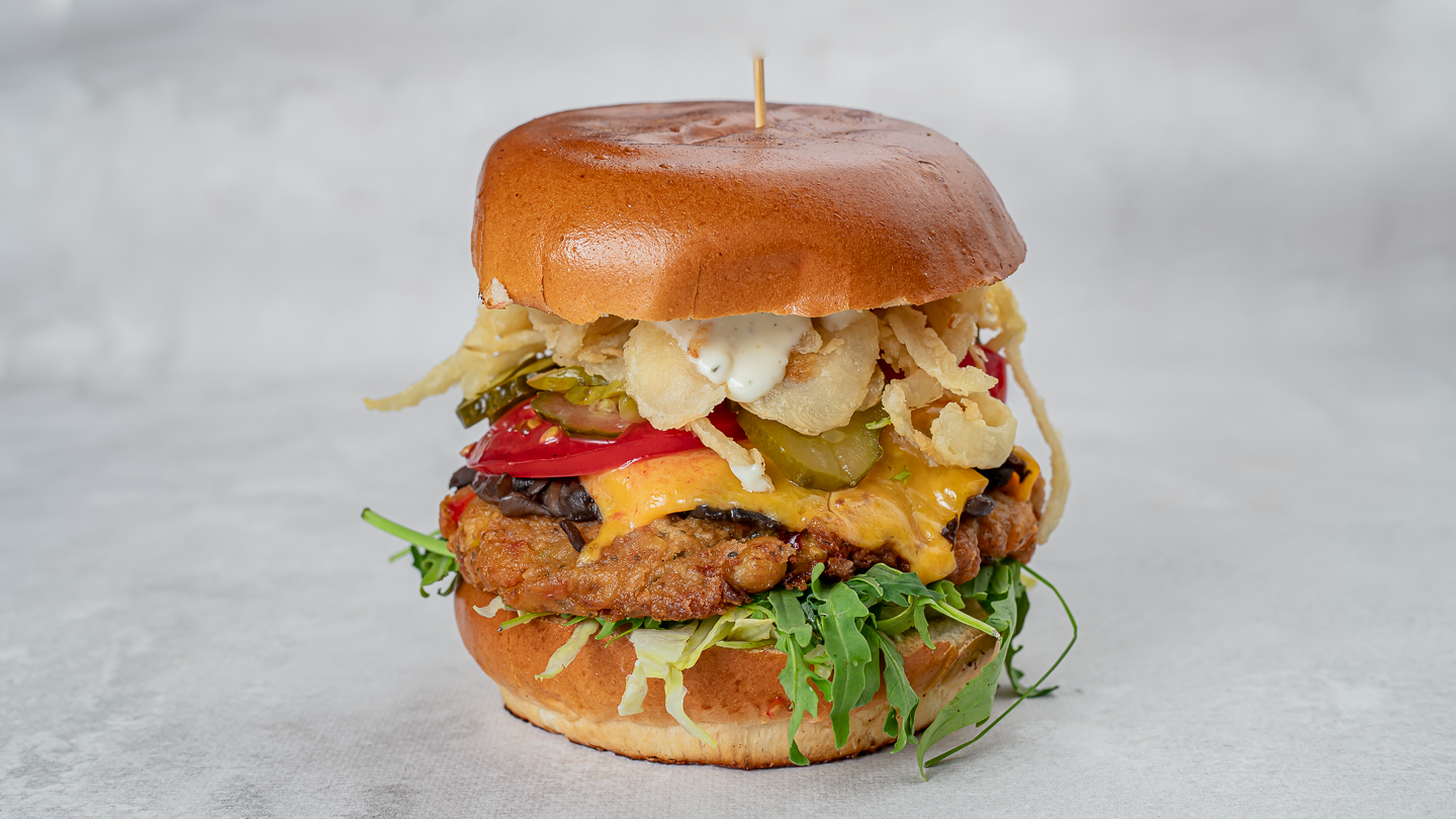 sos czosnkowy, burger z ciecierzycy, grillowane pieczarki, ser cheddar, pomidor, ogórek konserwowy, sałata lodowa, rukola, chrupiąca cebulka