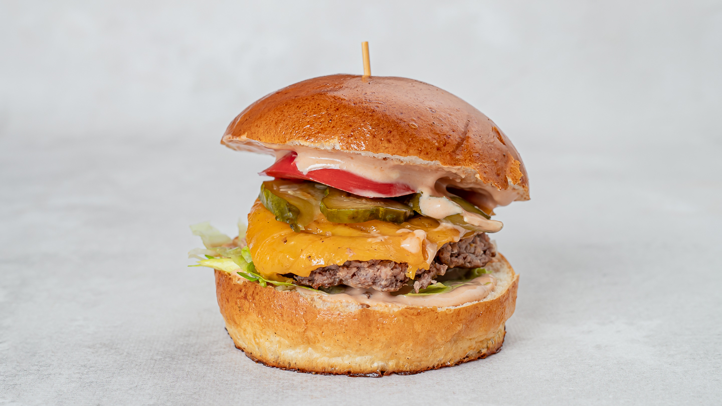 sos firmowy, wołowina 100%, ser cheddar, pomidor, ogórek konserwowy, sałata lodowa