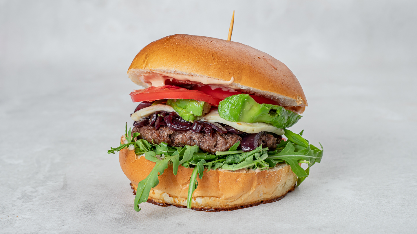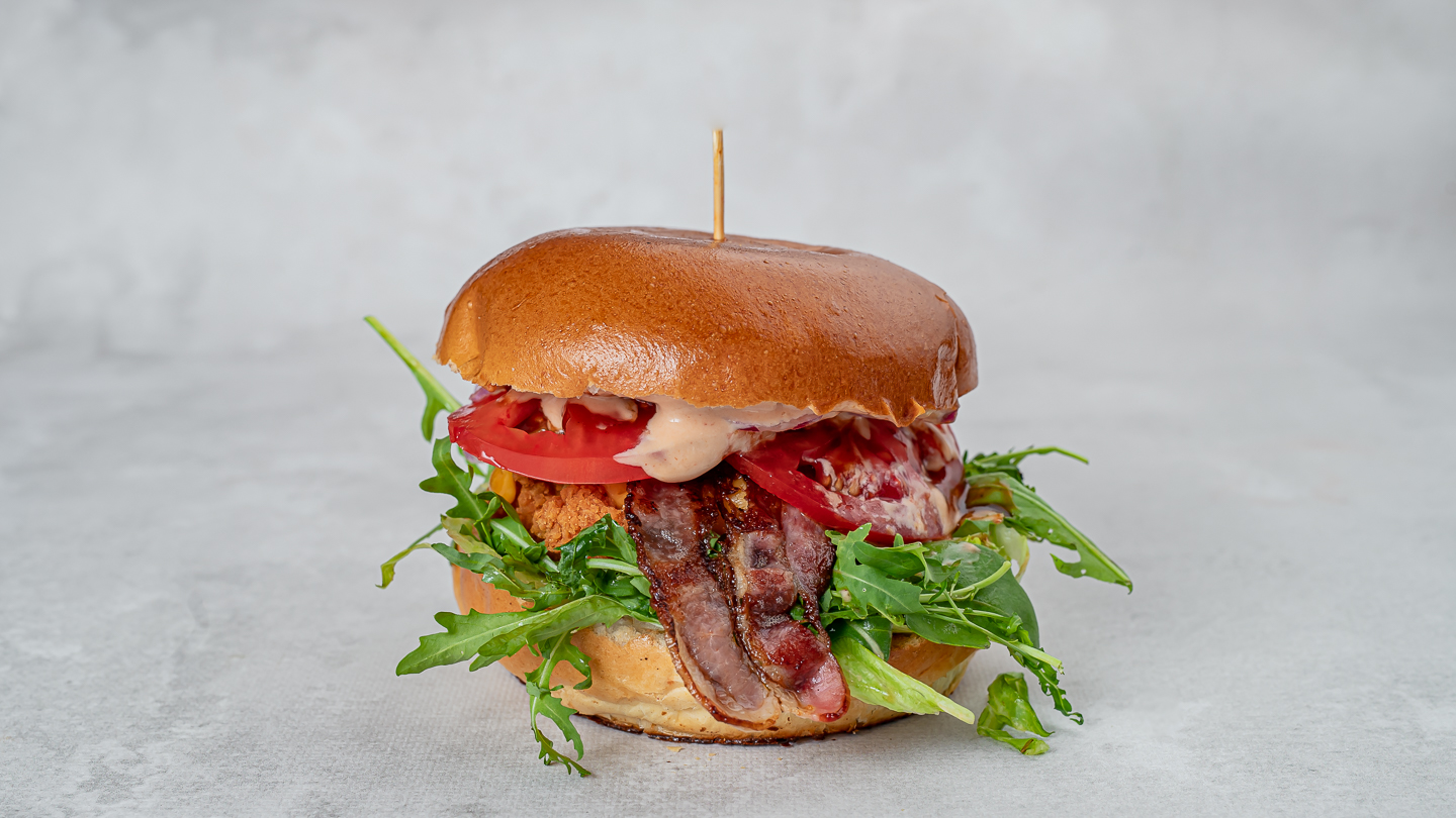 sos firmowy, sos BBQ, chrupiące polędwiczki z kurczaka, grillowany boczek, ser cheddar, pomidor, cebula czerwona, sałata lodowa, rukola